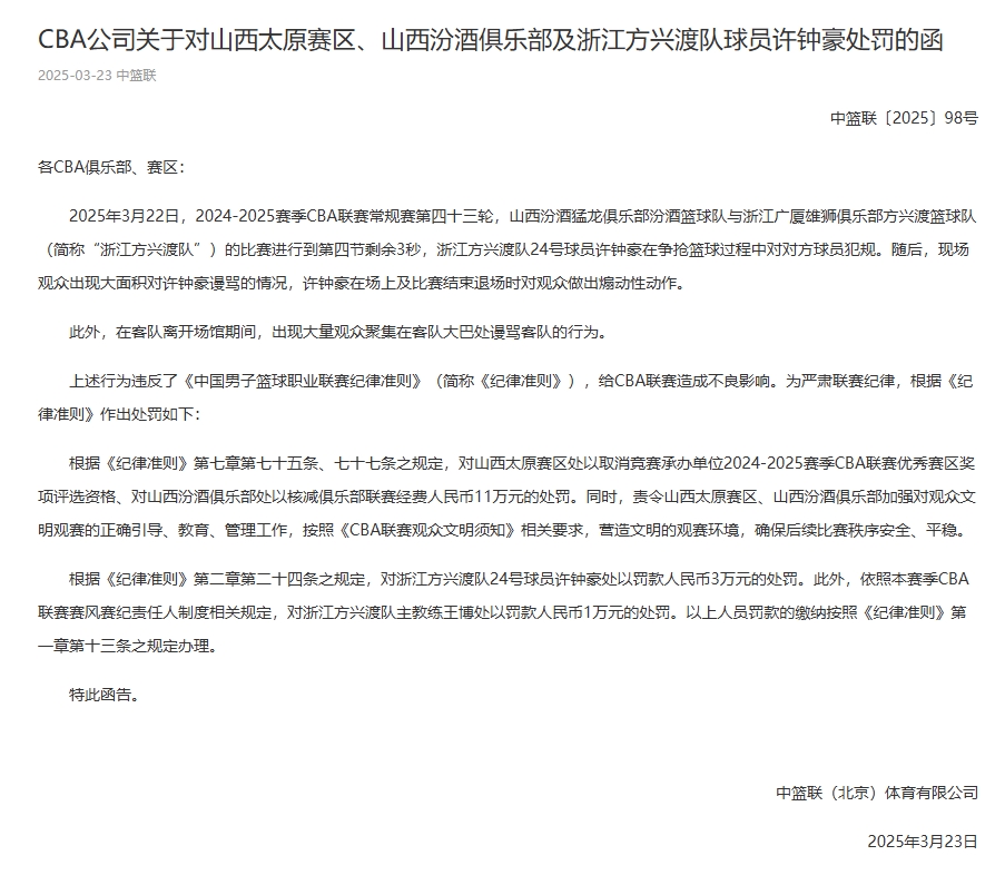九游会·j9官方网站1、山西赛区因观众聚集围堵客队大巴谩骂客队,被罚款11万,并取消优秀赛区评奖资格。