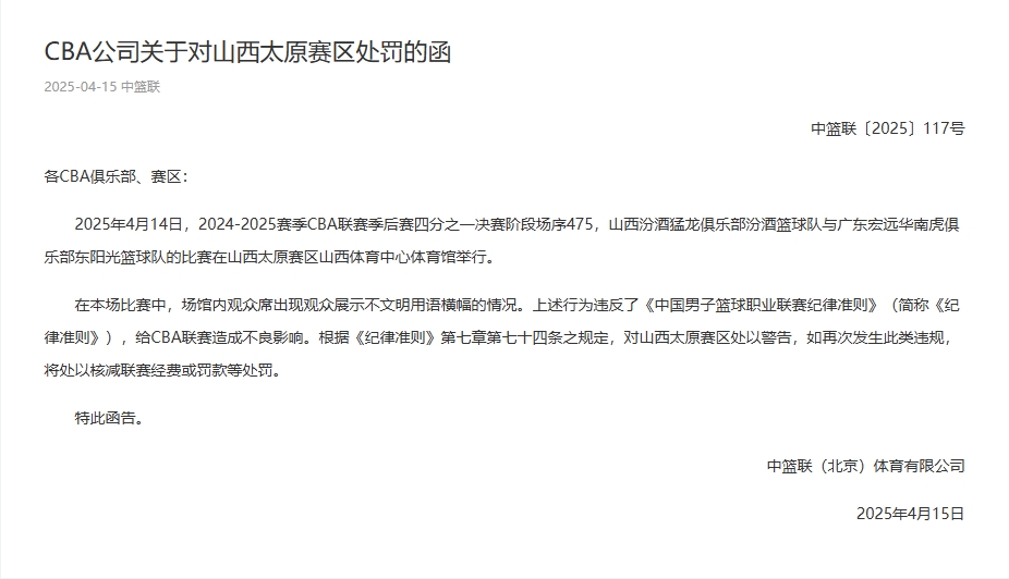 j9九游会官方登录4月18日讯 此前,CBA官方宣布了对此前晋粤大战双方违规行为的罚单,其中,山西赛区和山西俱乐部被严重警告,并核减15万经费。